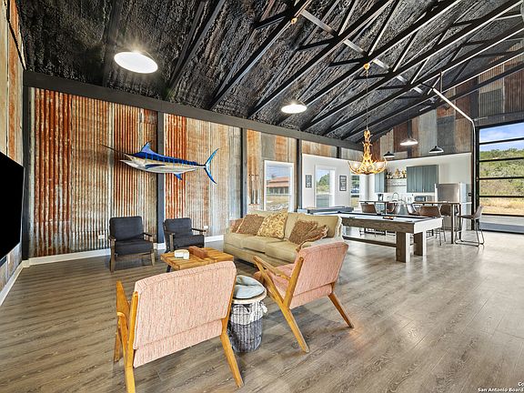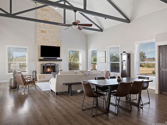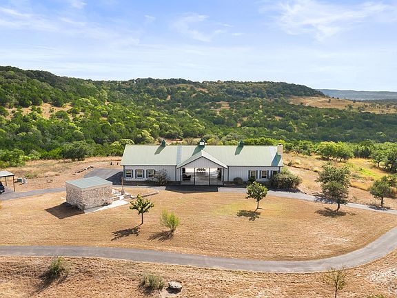 Welcome to an exceptional 60+/-acre high-fenced ranch nestled perfectly between Boerne and Fredericksburg, offering breathtaking panoramic views and a true Hill Country lifestyle. Perched atop a scenic hill is a spacious 3,200 sq ft dog-run style home featuring 4 bedrooms and 2 bathrooms. Designed for comfort and entertaining, the open-concept layout includes a large kitchen, vaulted ceilings, a cozy fireplace, and an expansive living area. An additional game room/recreation area makes it ideal for family gatherings, sports viewing, or simply relaxing. Abundant natural light pours in through a striking glass roll-up garage door, creating a seamless indoor-outdoor living experience. The home also boasts a spectacular breezeway-perfect for outdoor dining and entertaining-that connects the living spaces beautifully. Property Features: Large metal workshop for equipment or storage Chip-sealed roads leading to the main improvements Multiple trails throughout the property Stock tank for livestock, wildlife, or recreation Herd of whitetail deer-excellent for hunting Approximately 3,100 feet of RM 1376 road frontage Property is being sold fully furnished - truly turn-key and ready to enjoy! Location Highlights: Less than 30 minutes to both Fredericksburg and Boerne Under an hour to San Antonio About 1.5 hours to Austin Situated in one of the fastest-growing areas in the U.S. Whether you're looking for a private getaway, family retreat, or a recreational hunting property, this ranch offers it all-move-in ready, with every detail thoughtfully designed.