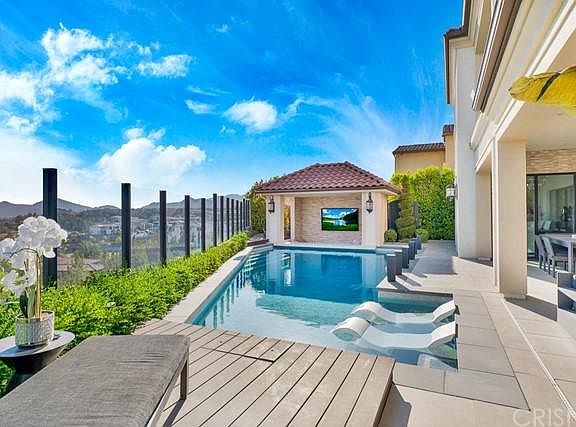 The definition of opulence!  The crown jewel on Jubilee!  Located within the prestigious Westcliffe community is this 5 bedroom entertainer's dream home, which makes model homes envious. From the moment you enter this showcase property, the stunning views of the Valley and the sparkling pool/spa/entertainment areas captivate your attention. The chef- inspired kitchen boasts a huge center island, Caesarstone counter tops & back splash, Wolf range, SubZero fridge, floor to ceiling exotic wood cabinets, wine fridge, Wolf built-in coffee maker. There is also a full & separate prep kitchen w/ Wolf range, exotic wood cabinets,  Caesarstone backsplash, huge pantry & more. The grand family room offers a romantic fireplace & stack stone wall. Formal dining room, perfect for entertaining & holiday gatherings w/ built-in buffet, Caesarstone counters,stack stone wall & exotic wood cabinets. Separate sitting area between the kitchen & family room. 1 bedroom downstairs, ideal for guests quarters or a home office. Travel up the winding, custom-made  iron staircase to find 4 more bedrooms, including a master suite that is unrivaled. The master suite features a separate sitting area, dual sided fireplace, amazing walk-in closet, dual sinks, separate tub, oversized shower w/ cascading overhead rain system, custom counters, custom floors, balcony w/ sumptuous views/ fridge/ wine fridge. Each bedroom offers its own private bathroom w/ tile-accented walls & large walk-in closets. Open loft w/ tile walls, balcony & fridge. No need to go on vacation. Beyond the impressive stacking doors, your private resort- style oasis awaits, complete w/ sparkling & inviting pool, separate spa w/ cascading water feature, swim up bar, a separate entertainers area w/ stack stone wall/ built-in table & benches/water feature & fire feature built into the table, covered patio w/ a warm fireplace,. Did I mention the stunning views? Surround sound system thru most of the home. Other top of the line features include powered window treatments thru most of the home, glass-enclosed wine room under the staircase. Smart home features. Formal entry w/ coffered ceiling. 2 car garage. No expense was spared in this luxurious home. Located near the Vineyards shopping center which boasts restaurants, a state-of-the art AMC movie theater, Whole Foods, shopping. Award-winning K-8 Porter Ranch Community School (buyer to verify) & the highly sought after Sierra Canyon private school. Sophisticated elegance is here!