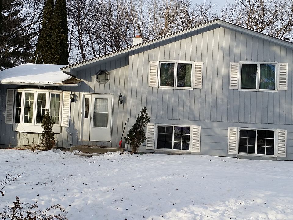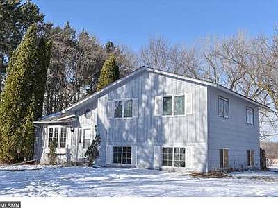 This beautiful four bedroom two bath home on 5 park like acres. The house has four easy flowing levels in a unique design. The main floor includes open living room with 12 ft vaulted ceilings and bow window, kitchen, and dining room with sliding glass doors leading out to the deck and over looking the back yard and pasture. The split for this home is in the center of the home for easy access. The upper level has a full bath, large master bedroom, two more nice sized bedrooms, with large windows and lots of natural light. The next level down from the main level is a 3/4 bath, bedroom, and a 15 X 20 family room, with an arched entrance door and stained pine wood on the walls and a cabin like feel with antler lighting. This level also has new carpet and new windows. The basement level is a 600 sq. Ft. with laundry room and furnace. In 2007 both bathrooms were remodeled, as was the family room and lower bedroom. The carpet on the lower level was replaced last month. The furnace, pressure tank, and hot water heater were also replaced along with the windows on the lower level in 2007. The out buildings include a detached 2 1/2 car garage (with electric), a possible, tiny house, shop or studio building, a storage shed, and a 36 X 48 pole barn built in 2005 for horses or livestock which includes 3 good sized box stalls built out of white oak, and a large area for hay storage. The barn has electricity and water. The acreage is fenced with electric fencing, and in 2005 was cleared out and seeded with horse grass. This 5 acres is surrounded by several hundred open acres. Peace and quiet are here everyday in this amazing setting! It is one mile outside Taylors Falls and 4 miles from a Walmart, Marketplace Grocery, Menards, 8 screen movie theater, golf and numerous eating establishments. It is 25 minutes north of Stillwater, and 50 minutes to the Twin cities. Country living within 1 hour from the cities. Agents Welcome at % 2.7. Pre-approved Cash or Conventional or Rural Development. Hurry before it's gone!! For appt. Please call 651-706-5142!!