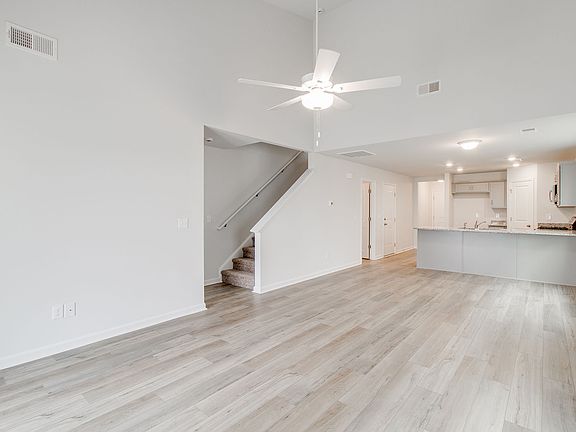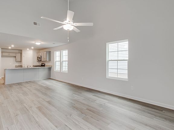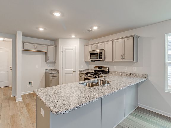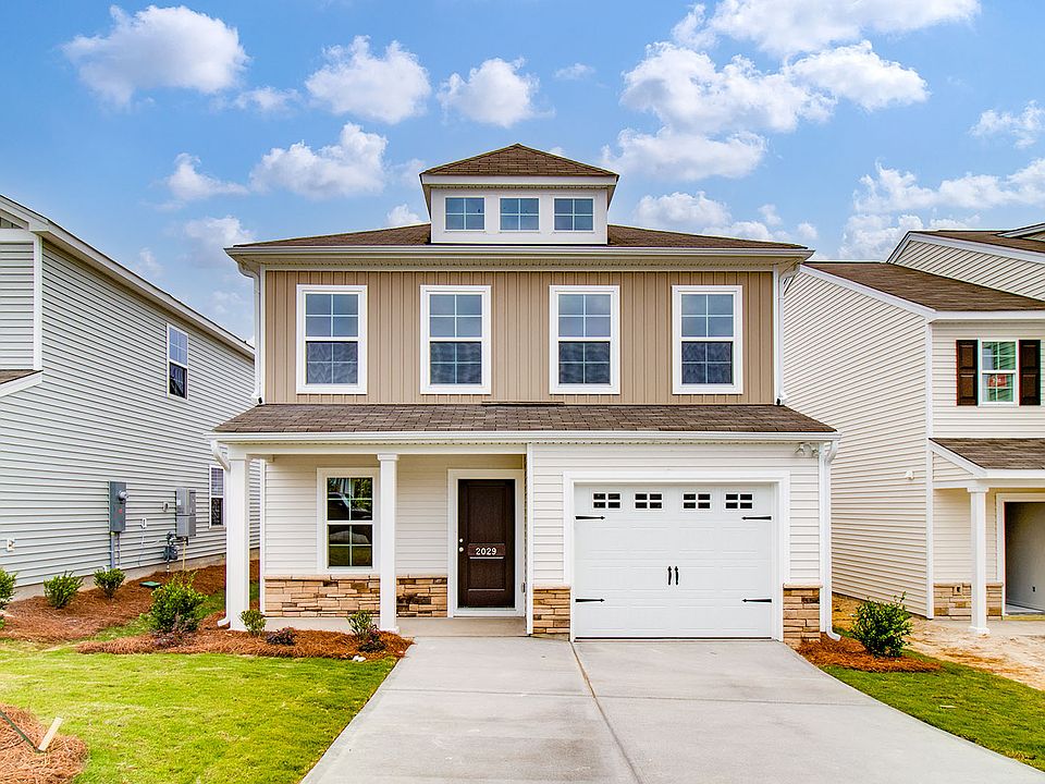 The Evans floor plan offers four bedrooms and two- and-one-half bathrooms. Your primary suite and laundry room are conveniently located on the main level. Off the front porch, you are greeted by a foyer with a coat closet and hallway that leads into the kitchen, equipped with a stainless-steel gas range, upgraded cabinets, and granite countertops. The peninsula island overlooks the eat-in area, as well as the great room with a vaulted ceiling. The primary suite offers a sizable walk-in closet, dual sinks, and a tiled shower. Upstairs encompasses two secondary bedrooms that share a bathroom, as well as a bonus room that could be used as a bedroom. Outside you will enjoy a covered porch with an attached storage room!