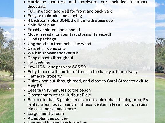 Immaculate 4-Bedroom Brick Home with Bonus Office, 3-Car Garage & Half-Acre Lot This stunning custom-built brick home, only two years old, still feels like brand new construction! Nestled on a beautifully maintained half-acre lot, this home showcases superior craftsmanship from a local custom builder known for quality and attention to detail. Step inside to a spacious split floor plan with four large bedrooms and a private office with French doors overlooking the peaceful front yard. The interior has been freshly painted and professionally cleaned, offering a true move-in ready opportunity with the potential for a fast closing. The builder upgraded the flooring throughout the main living areas to tile that looks like wood, combining beauty and durability for effortless maintenance. The kitchen features crisp white cabinetry, a navy-blue island, an upgraded backsplash, and granite countertops throughout. All appliances convey, and a brand-new blinds package adds a fresh finishing touch. Enjoy the oversized laundry room, carpet only in the bedrooms, and stylish mirrors and trendy fixtures throughout the home. The three-car garage is fully painted inside and comes equipped with hurricane covers and hardware, providing both peace of mind and potential insurance discounts. Outside, the fully irrigated lawn and flat landscape make yard maintenance simple and parking effortless. Behind the double gate, there’s additional parking for an RV or boat, offering easy access and plenty of space for outdoor toys. This home is connected to public sewer and located in a desirable community with a low annual HOA of just $565. Residents enjoy access to an impressive recreation center featuring three pools, tennis and pickleball courts, a sauna, steam room, fitness center, boat launch, RV parking, and much more. This home truly has it all—modern construction, thoughtful upgrades, and resort-style amenities—ready for you to move in and start enjoying the best of Florida living!