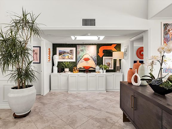 UNFURNISHED South Palm Springs Mid-Century Modern Lease 2 Bed (both en-suite) 2.5 bath and 5 patios.... all single level. no steps and no unit above. Step into desert living at its finest in this vibrant condo nestled in the heart of South Palm Springs. Lush greenery and colorful blooms lead to a private patio that sets the tone for this bright and airy retreat. Inside, soaring wood-beamed ceilings and 3D textured accent walls create a dramatic backdrop for the home's bold, mid-century flair. The spacious living area features large sliding glass doors that open to several shaded patios perfect for morning coffee or sunset cocktails surrounded by flowering hedges and mountain views. The open-concept layout makes entertaining easy, while each bedroom enjoys its own bath and plenty of natural light, making the condo feel more like a single family home. Condo boasts in-unit laundry and it's special location provides unique direct pool access. Located in a well-kept community with resort-style amenities, this home offers easy access to local dining, golf, and hiking trails all just minutes from downtown. Stylish, peaceful and comfortable, this Palm Springs condo is a true desert escape. Note: photos are from when unit was furnished. Unit is offered UNFURNISHED Water is included.