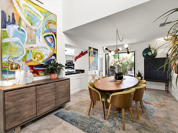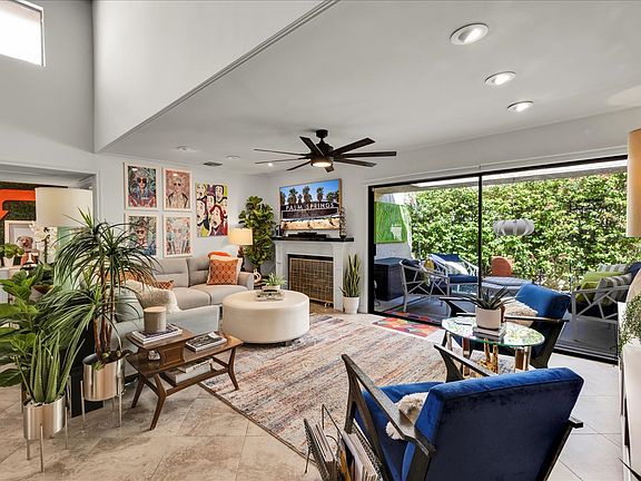 Private patioFlowering hedgesMountain viewsOpen-concept layoutBold mid-century flairSoaring wood-beamed ceilingsIn-unit laundry