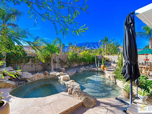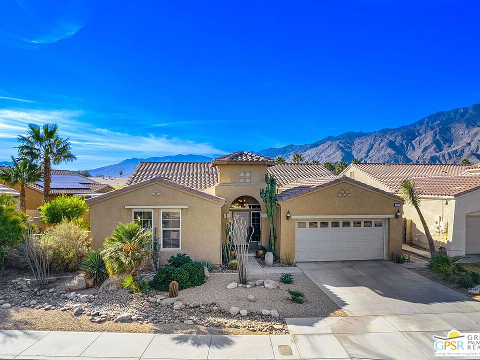 Welcome to this stunning single-level home in the desirable 55 and over Four Seasons community. This Canyon II plan home offers breathtaking southwest views of the San Jacinto mountain range and the glistening saltwater spa and wading pool. As you step inside, you are greeted by a grand entrance that leads to a spacious great-room adorned with a cozy gas fireplace. The large, bright kitchen boasts ample storage and counter space, making it a perfect place for culinary enthusiasts. The entire home is elegantly tiled, offering both luxury and easy maintenance. The roomy primary bedroom suite features a spacious bath with both a tub and shower, while the second bedroom offers a junior en suite. Additionally, the home features a generous den that can be utilized as a home office, TV room, or easily converted into a third bedroom. Enjoy the energy benefits of a new pool heater and newly installed solar panels that provide the energy needed for this grand home, including a new air conditioner in the garage, creating a versatile space for hobbies or a home gym. The Four Seasons community offers an array of activities and social opportunities, including multiple pools and spas, a fitness center, tennis and pickleball courts, bocce, shuffleboard, group barbecue areas, a library, computer lab, and a billiards room. The lodge area provides a wonderful space for gatherings and relaxation. Don't miss this opportunity to experience resort-style living in this exquisite home. Schedule a showing today and make this your slice of paradise in Palm Springs.