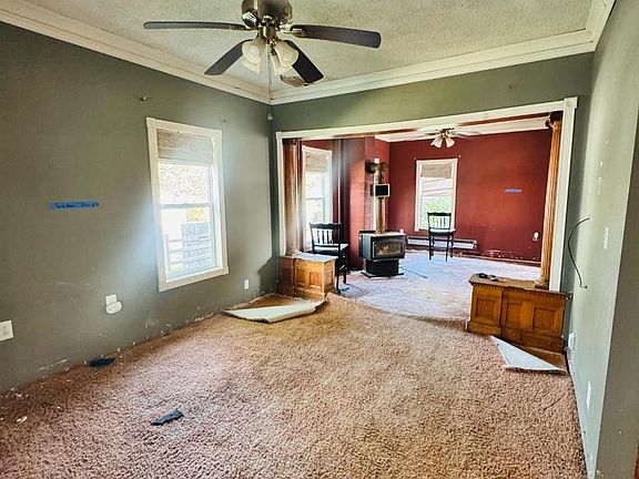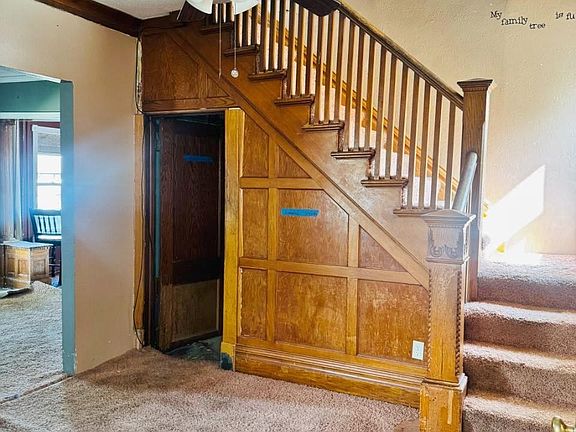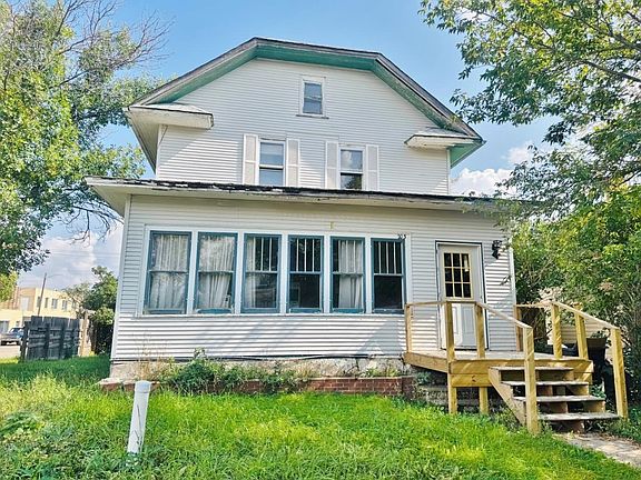 Calling all investors, flippers, or buyers looking for a project! This spacious two-story home sits on a generous corner lot just one block from the school and a block from downtown, offering lots of convenience. The main floor includes a covered front porch, a large entryway, a generous living room, a spacious dining area, a kitchen, and a 3/4 bathroom with laundry. Upstairs, you'll find four bedrooms and a full bathroom. Much of the home has original hardwood flooring under the current coverings, just waiting to be refinished and brought back to life. Outside is a large fenced yard and a detached double garage. Last winter, the home experienced a freeze that caused the pipes to break. Servpro was brought in to begin remediation, but the heat is currently non-functional, and plumbing repairs are still needed. The electricity is also off, so flashlights welcomed! Due to the current condition of the property, this is a cash-only sale. With its large footprint, classic layout, and prime location near the school, this home has all the makings of a rewarding renovation project. Bring your vision and make it your own!