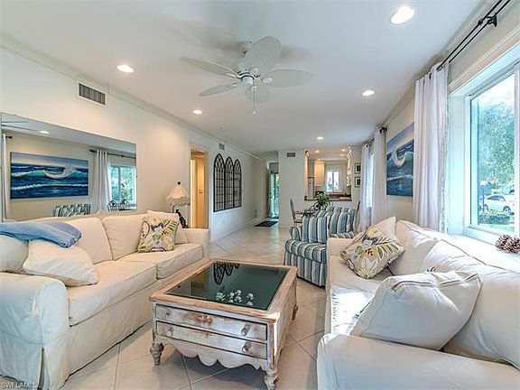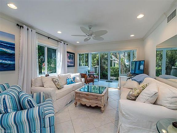 Ideal location in Olde Naples.....just 2 blocks from the beach and 2 blocks from 5TH Avenue, this large 1400+ sq ft, 2 bedroom, 2 bath, ground floor end unit condo "lives like a home" and is surrounded by a green oasis with with a lush tropical courtyard in a beautifully maintained building. It is located on the SW corner of this 15 unit building with large new hurricane windows and a sunken glassed-in lanai with a walk-out to an outdoor patio. Kitchen is updated with granite countertops, recessed pot lighting, washer/dryer, new A/C, large walk-in closets, large tile throughout and crown moulding. Covered designated parking spot newly updated with brick pavers and a large storage area......this condo brings the outdoors in.........A MUST SEE!