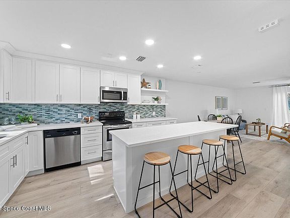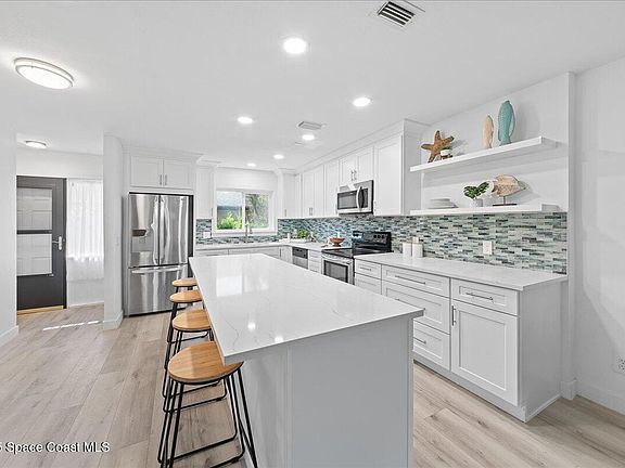 Updated townhome style condo directly across the street from beach access and only a few minutes stroll to downtown Melbourne Beach and a River access straight down the street. Garage parking + an assigned open spot. Recent kitchen remodel opened up the downstairs and features a beautiful, Quartz island, glass mosaic backsplash , quality cabinets and a nice stainless steel appliances. Dual en suites upstairs, both with brand new vanities, impact rated windows, new ceiling fans and more. New Roof 2025. HOA includes exterior insurance and maintenance, cable tv, internet, pest control, water, sewer and trash. Concrete block construction. Call today !