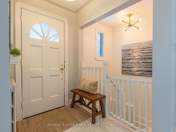 This pretty vintage bungalow graces one of Cobourg's most coveted streets, steps from the beach boardwalk at the south end of the street. This premium location is walkable to all of downtown Cobourg's amenities. Solidly built and thoughtfully renovated, this home retains its original charm while offering modern updates. Start your day with coffee on the welcoming front porch. The kitchen is a showstopper, featuring custom cabinetry, sleek stainless appliances, and elegant quartz surfaces. An oversized east-facing window bathes the living room in natural light, and the ample sized dining room sets the stage for intimate gatherings. Original oak hardwood floors flow through the bedrooms and living spaces, beautifully contrasted by porcelain tile in the kitchen and heated porcelain in the bathrooms. A cost effective radiant heating system and modern cooling system ensures consistent comfort throughout every season. The primary bedroom provides ample space for a king-size bed. The 2nd bedroom, currently utilized as an office, conveniently opens to the outdoor living area with a patio and backyard. The lower level expands your living space with an additional bedroom, a versatile den, a laundry room, and abundant storage options.