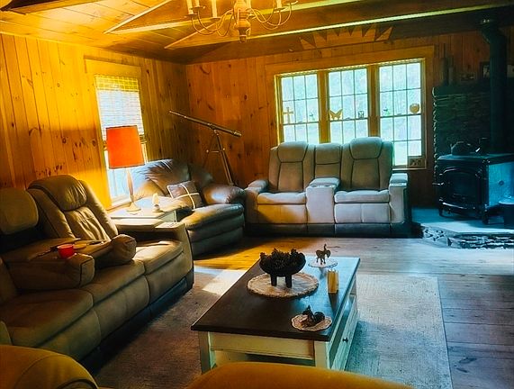 Welcome to Templeton. Come see this beautiful 9.5 acres of trees, land and a small pond. This 7 room house has just been re-stained. Plenty of outdoor room for barbeques and large gatherings. There is a 2 floor barn with wood stove, paddock, greenhouse, shed with chicken coops, garden areas, and large garage. Now the house. Enter into a beautiful hand crafted home. The dining room has a wooden stove. The living room has a fireplace. The kitchen is sunny and cute. There is a sunny and very large great room with a wood stove. Right of the great room is a large mudroom for hanging coats and storage. Upstairs has a large bedroom with custom shelving and a large cedar closet. The second bedroom also has a large cedar closet. The bathroom has tile and a custom vanity.