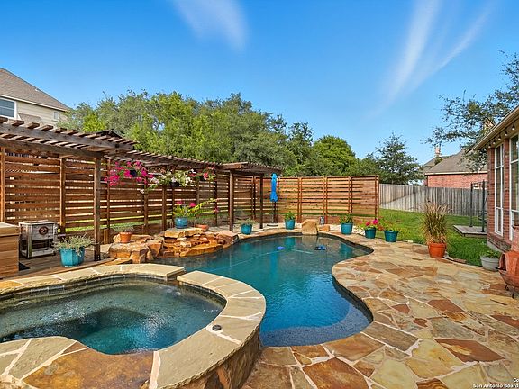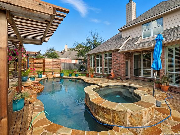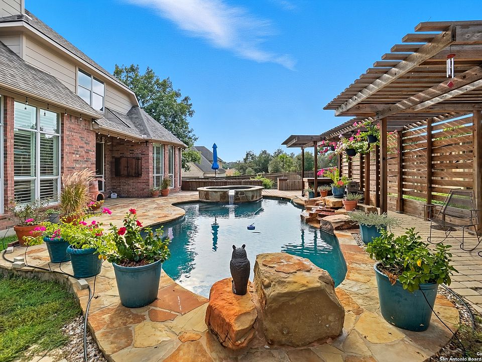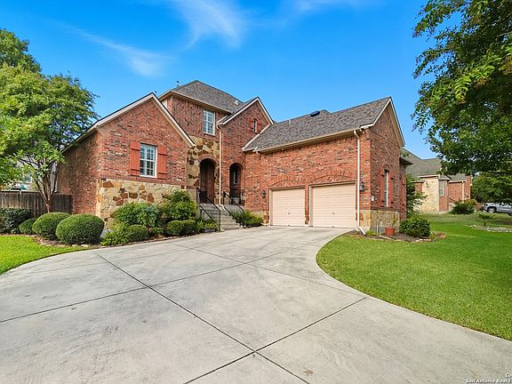 Nestled in the gated enclave of the Stone Oak Mesa Grande, this stately residence sits on a beautifully landscaped .36-acre lot. Featuring five bedrooms plus a dedicated study, the layout includes a private upstairs guest suite-ideal for visitors or multigenerational living. The expansive open-concept living room impresses with soaring ceilings, abundant natural light, and a cozy gas fireplace. The spacious island kitchen features gas cooking, extensive cabinetry, and generous prep space for any culinary endeavor. Upstairs offers a large second living room- perfect for media, play, or fitness, and a versatile bonus room. The primary suite is a peaceful retreat, complete with a sitting area. Step outside into a resort-style backyard oasis, highlighted by a custom heated pool and spa designed by Keith Zars Pools. Surrounded by mature landscaping and ample patio space, it's perfect for year-round entertaining. Additional highlights includes abundant storage space in the garage.