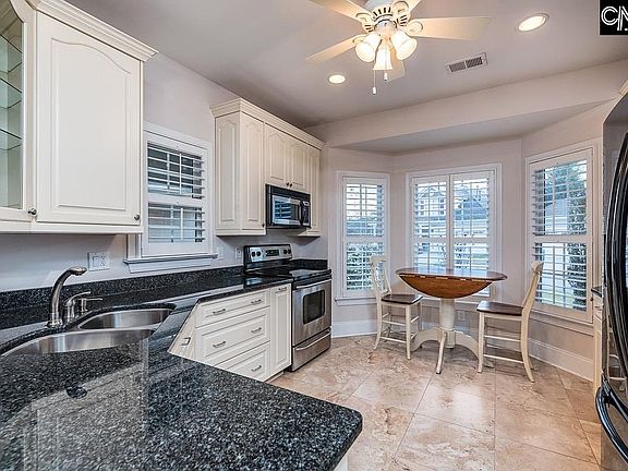 - Kitchen: Bar, Counter Tops-Granite, Eat In, Bay Window, Floors-Tile, Cabinets-Painted, Backsplash-Granite
