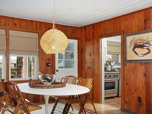 The main level showcases authentic knotty pine tongue-and-groove paneling throughout the living areas and three private bedrooms. Outdoor living is a highlight with a covered front porch for enjoying ocean breezes and a brand-new rear deck overlooking a spacious backyard. The third level is dedicated to the primary suite, featuring panoramic ocean views.