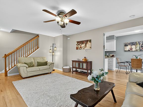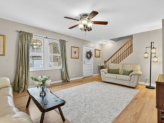 End unit in a beautiful Bloomingdale area! This charming 2-bedroom, 1.5-bath townhome offers a fantastic layout with beautiful hardwood floors on the main level. The spacious living and dining area opens to a private deck through sliding glass doors-perfect for relaxing or entertaining. The kitchen flows easily into the dining space, and a convenient half bath completes the main floor. Upstairs, you'll find two generously sized bedrooms with wood laminate flooring and a shared full bath. The primary bedroom features a large walk-in closet and plenty of natural sunlight throughout. The fully finished basement provides even more living space with a large entertainment room, laundry area, and a versatile bonus room ideal for an office or guest space. Attached 1-car garage and excellent Bloomingdale location close to parks, shopping, and dining. Move-in ready