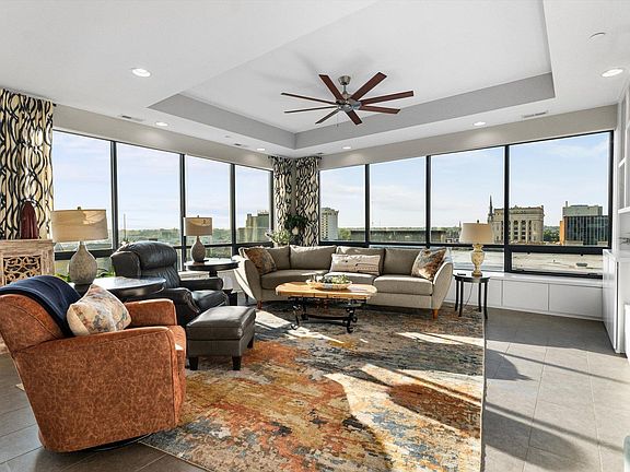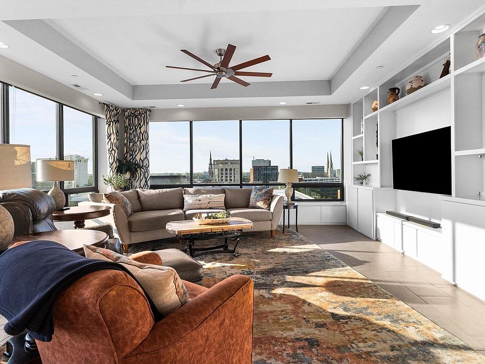 Enjoy the best of Downtown in this beautifully updated condo, just steps from restaurants, shopping, and entertainment. This spacious 2-bedroom, 2-bath home features an open floor plan, fresh paint, and energy-efficient glass walls that showcase stunning city views. The modern kitchen boasts custom cabinetry, granite countertops, a custom wood breakfast bar, new stainless steel refrigerator and dishwasher. The primary suite offers a large walk-in closet, dual vanities, and a tiled walk-in shower. Additional highlights include a flex space/den, a spacious secondary bedroom and a laundry room with stackable washer/dryer, countertops, and ample storage. The living room has a sleek built-in entertainment area, floor-to-ceiling windows and window seats with hidden storage, perfect for both style and function. Enjoy convenience with 3 deeded parking spaces in the covered garage (2nd & 4th floors), storage closet on 3rd floor and access to the 5th-floor common outdoor patio with modern furnishings and a built-in grill. This move-in ready condo combines modern design and convenience.