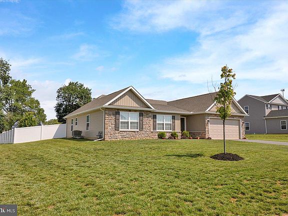 Welcome to this better-than-new, move-in ready gem located in the desirable Meadow Lane Farms community! Situated on nearly half an acre in the heart of Lebanon County, this beautifully maintained home features 3 bedrooms, 2.5 bathrooms, and a thoughtfully designed single-level layout. The spacious, open-concept living and kitchen area is perfect for entertaining, showcasing a bright sunroom, mudroom, and a kitchen equipped with stainless steel appliances, granite countertops, a gas range, stainless range exhaust hood, pantry, and ample Echelon Allwood cabinetry. Enjoy the added charm of a breakfast bar and recessed lighting throughout. The luxurious owners suite offers a full bath, an expansive walk-in closet, and additional linen storage. Engineered vinyl plank flooring flows through the foyer, kitchen, front hall, and mudroom for both style and durability. The home is heated with economical and efficient natural gas heat, keeping comfort affordable year-round. Step outside to a fully vinyl-fenced backyard, a 12x16 shed with overhead storage, and plenty of space to relax or play. Ideally located just minutes from shopping, dining, and major highways, this home offers both comfort and convenience — don’t miss this incredible opportunity!
