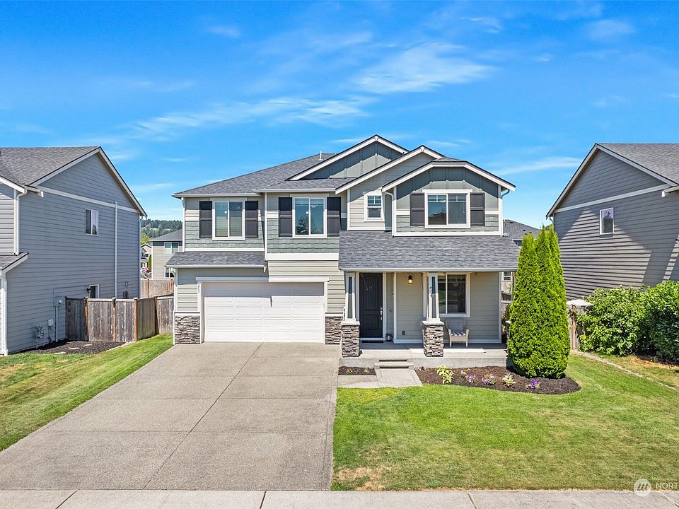 Charming former Richmond model home located in desirable RiverEdge community. Don't miss the updated kitchen and newer laminate flooring! The main floor features 9'ceilings, office/den with designer accents, French doors and built-in shelving. Open concept living room is a great space to gather with large open concept living area, tons of natural light. Also has recently redone fireplace with custom shelving on each side. Gourmet kitchen features dbl oven, granite counters & walk-in pantry. Slider opens to huge deck with large, fully fenced yard. Upstairs laundry, loft & 4 bedrooms, including an elegant master suite w/ private bath, quartz counters & walk-in closet. Finished garage includes painted walls and floor. Includes A/C!
