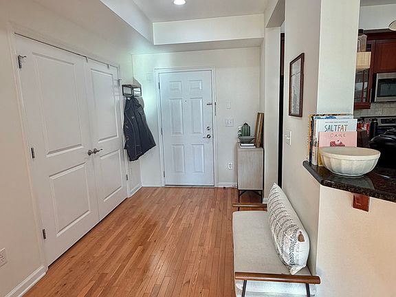 Large balcony facing nycHigh ceilingsCovered garage parking spaceHardwood floorsBar seatingStainless steel appliancesOpen layout