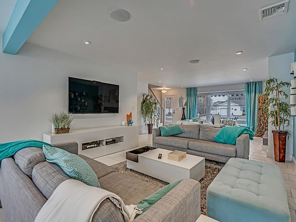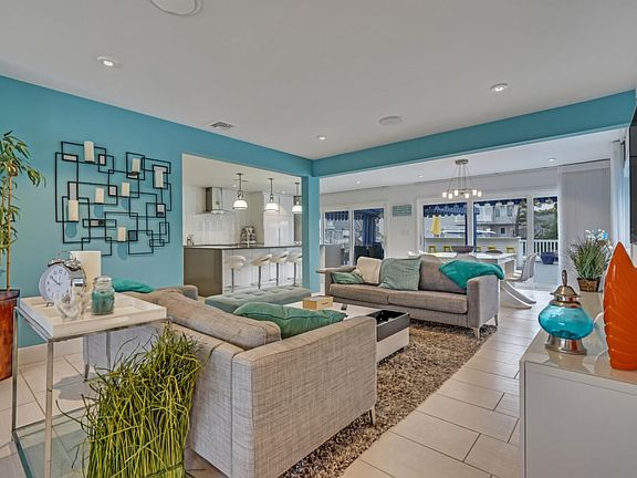 Newly renovated 5 bedroom, 2 bath waterfront Cape with modern interior design, features an open floorplan encompassing living room with gas fireplace, family tv area, designer contemporary kitchen with a large center island, and dining area with dual 12 ft sliding glass doors seamlessly opening the inside to the outside living space; A BACKYARD OASIS. Exterior features a Trex deck with awning covered seating area with tv, in-ground heated salt water pool, featuring new pool equipment and remote access. Fire pit area with outdoor tv, full wet bar with fridge, ice maker, and dual kegerator, outside shower, shed,and side yard with bonus picturesque PUTTING GREEN a must see!! Over-sized property features 90' of vinyl bulkhead with a trex dock on protected lagoon with boat lift.