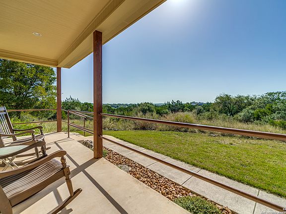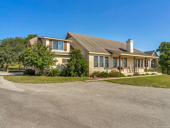 Tucked away on 4 private acres in the desirable Cordillera Ranch community, this inviting 4-bedroom, 4-bathroom home offers space, comfort, and scenic Hill Country views from its elevated setting. A wide front porch welcomes you with relaxing views of the surrounding trees and countryside, a perfect spot for your morning coffee or evening unwind. Inside, you'll find an open floor plan that makes everyday living and entertaining easy. The island kitchen features granite countertops, generous cabinetry, a walk-in pantry, and a large sink overlooking the backyard and pool. A breakfast area sits just off the kitchen, and the space flows into the main living room, where you'll find a cozy bar nook with wine fridge, and a floor-to-ceiling stone wood-burning fireplace. Doors open to the front porch, blending indoor and outdoor living. A separate dining room provides additional space for gatherings and special occasions. The primary suite is bright and spacious, with large windows that let in plenty of natural light. The primary bathroom offers a double vanity, a roll-in shower with a fold-down bench and hand-held shower head, soaking tub, and a walk-in closet with ample built-in drawers and shelves. Downstairs also includes two secondary bedrooms, two full bathrooms, and two office spaces with one office including a closet, making it a great option for a fifth bedroom. Upstairs, you'll find a game room, the fourth bedroom, and another full bathroom, offering flexibility for guests, hobbies, or extra living space. Out back, enjoy a covered patio, outdoor kitchen with gas grill, a stone fire pit, and a pool and hot tub, all surrounded by trees and open skies, giving you a peaceful place to relax or entertain. Additional features include a 3-car garage, laundry room, and an additional utility room with a shop sink. This home has plenty of room to make this property your own. If you're looking for privacy, space, and beautiful country surroundings, this home in Cordillera Ranch is a must-see.