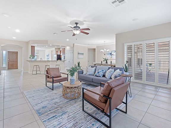 This desirable Pemberton floorplan offers a peaceful setting, backing to a lush greenbelt with the golf course just beyond—providing privacy without direct golf activity. As you enter, you’re greeted by the beautiful backyard views and a grand living room with plenty of space for a large sectional or multiple seating areas. Designed for both comfort and entertaining, the home features an oversized kitchen with center island, granite countertops, abundant cabinetry, and a breakfast bar for gathering. A formal dining room and casual breakfast area provide versatile dining options. The thoughtful layout includes 3 bedrooms, 2.5 baths, and a dedicated study located in the front of the home. The primary suite is privately situated in its own wing, separate from the two guest bedrooms. Fresh interior paint, extensive tile flooring, and brand-new carpet in the bedrooms (installed August 2025) create a move-in-ready feel. Plantation shutters accent the rear windows and sliding door leads to the screened porch and extended patio with tranquil water feature. Extra wide 2.5 car garage with new opener provides valuable space and storage. Residents of Sun City enjoy a vibrant 55+ lifestyle with 3 golf courses, 5 amenity centers (including nearby Cowan Creek), 4 fitness centers, 8 pools, 12 tennis courts, 26 pickleball courts, miles of trails, countless clubs, and more.