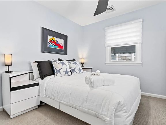Each bedroom is thoughtfully designed to capture the laid-back charm of the Jersey Shore, offering a peaceful retreat after sun-filled days. Two bedrooms feature queen sized beds with the third having a king. Bedrooms come complete with fresh linens, abundant natural light, and spacious dressers for easy unpacking. All rooms are enhanced with a dedicated workspace which doubles as a makeup bar, ideal for remote work, journaling, or getting dolled up before a night out on the town. 1 full bathroom features a beautiful glass rain shower with tiled surround, stocked with fluffy towels, hotel-style toiletries, and everything you need to freshen up after a day at the beach. The shower also features a fold down bench and grab rails.