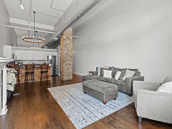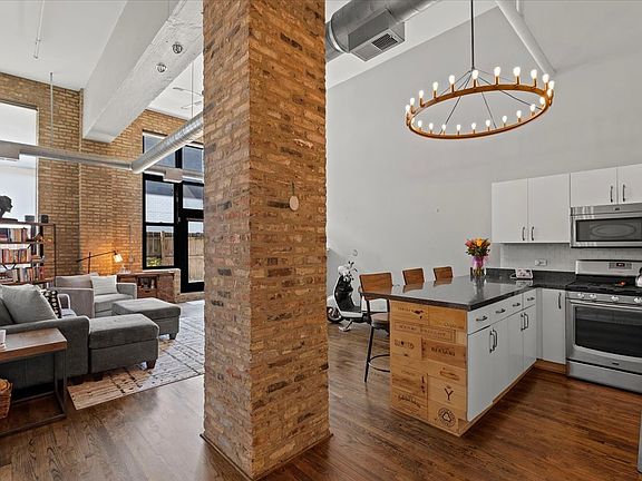 Exceptional West Loop Loft! This 1,100 sq ft renovated loft features 16' ceilings, exposed brick, and a private patio. The private gated parking spot is included in the price and located right outside the unit, perfect for easy access for groceries or during the colder months. The spacious living room has giant south-facing windows that fill the space with abundant natural light, plus oak wood floors throughout and a gas fireplace. The space includes two Restoration Hardware chandeliers and a carrara marble double vanity. The bathroom has a Jacuzzi tub and toilet. The kitchen features a breakfast bar. Storage is plentiful with a master bedroom walk-in closet, a second closet, hallway closet, and a large extra storage closet just outside the unit for ease of use and access. On-site exercise room and bike room. This is the only patio in the building with an outdoor hose. Walk to everything. Target, Whole Foods, and Mariano's, are all less than four blocks away with Mary Bartelme Park across the street.
