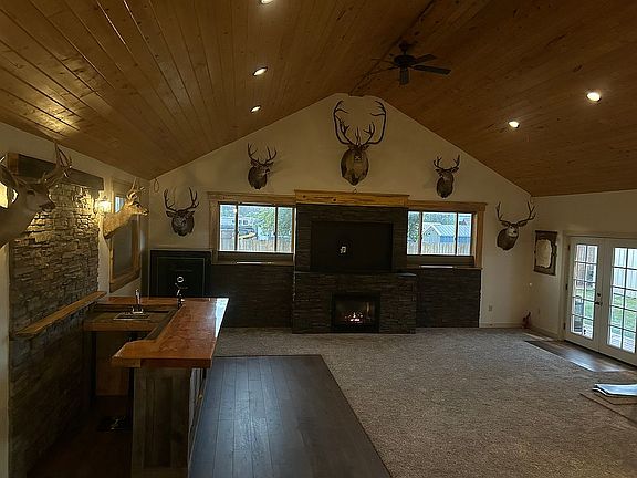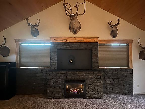 Step into a warm, inviting space with vaulted tongue-and-groove ceilings, surround sound, and a propane stove perfect for cozy nights. The open-concept kitchen features custom hickory cabinets, concrete countertops, and black and stainless steel appliances, ideal for cooking and entertaining.