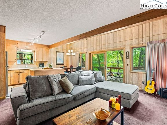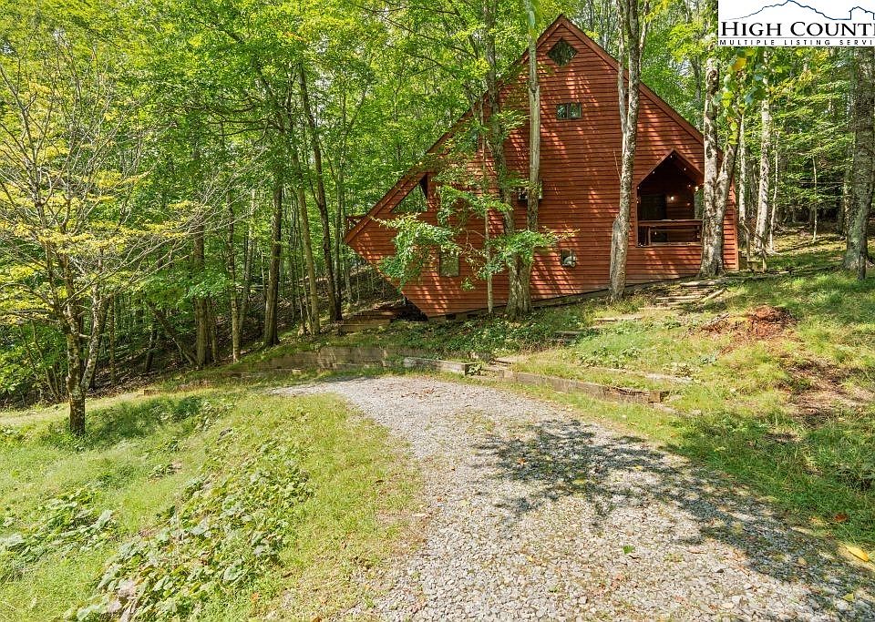 Discover this unique and spacious two-bedroom, two-and-a-half-bath Canadian Red Cedar home nestled on Beech Mountain. Located just off Charter Hills, this architectural gem offers seasonal slope and mountain views. The main level features vaulted ceilings and an open-concept kitchen, dining, and den area with a stunning large stone fireplace, creating a warm and inviting atmosphere. Step onto the back deck and enjoy the tree house ambiance surrounded by nature. Upstairs, you'll find a large primary bedroom with vaulted ceilings and a modern en-suite bath featuring a walk-in tile shower and double vanity. Storage is plentiful throughout the home with ample closets. The lower level offers another spacious bedroom and full bath, currently set up as a media/production room, with a separate entrance leading out to the backyard. Additional amenities include newer laundry appliances, ample parking, and a large storage shed at the back of the property. With a bit of imagination, one can see the possibilities of the lower level becoming a guest suite. Come and check it out and make this sweet spot yours! Trailhead to Pond Creek hiking trail is just around the corner, as well as the Beech Mountain Resort. Please note: furnished with exceptions. Professional measurements differ from tax records. The tax card's square footage reflects only the main living area and decks, excluding the finished basement and upper level. The seller purchased the home in its current condition — no permits found on file.