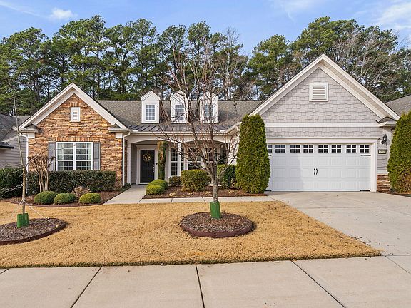 Welcome home to this beautifully designed two-story Tangerly Oak plan in the highly desirable 55+ Del Webb Carolina Arbors community—where comfort, space, and easy living come together. Beautifully situated on a serene lot that backs to woods. With 4 bedrooms and 4 full baths, this thoughtfully designed home lives primarily on the main level, featuring three bedrooms on the first floor, including a spacious primary suite, ideal for everyday living. The heart of the home is the gourmet kitchen, complete with a gas cooktop, wall ovens, a large center island, walk-in pantry, and sunny breakfast area—perfect for casual mornings or entertaining friends and family. The kitchen opens seamlessly to the inviting family room with a fireplace, as well as the formal dining room, creating a warm and connected living space. A light-filled sunroom extends the living area and leads to the covered porch and extended patio, where you can relax and enjoy peaceful wooded views year-round. Upstairs, guests will appreciate a private retreat featuring a bedroom, full bath, bonus room, and walk-in storage, offering excellent flexibility for hobbies, visitors, or additional living space. Additional highlights include an extended garage, abundant storage throughout, and a prime location within the community. Enjoy low-maintenance living and resort-style amenities, including a clubhouse, indoor/outdoor pool, fitness center, pickleball and so many clubs and activities. Close to Brier Creek shopping, restaurants and RDU.
