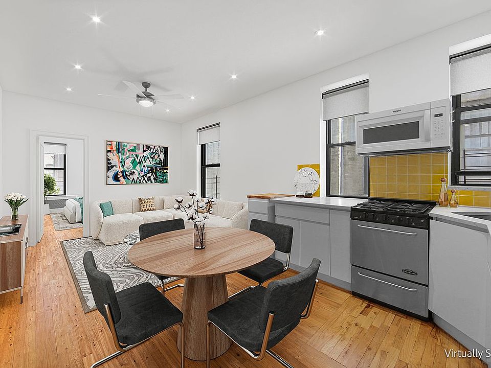 Perched on the top floor, Residence 53 offers a serene, sun-filled setting. A gracious entry hall with a large utility closet leads into a bright and airy living/dining area, where gleaming hardwood floors and high ceilings create an inviting sense of openness. The windowed, renovated kitchen is a highlight, featuring stainless steel appliances, new countertops, and a cheerful backsplash.