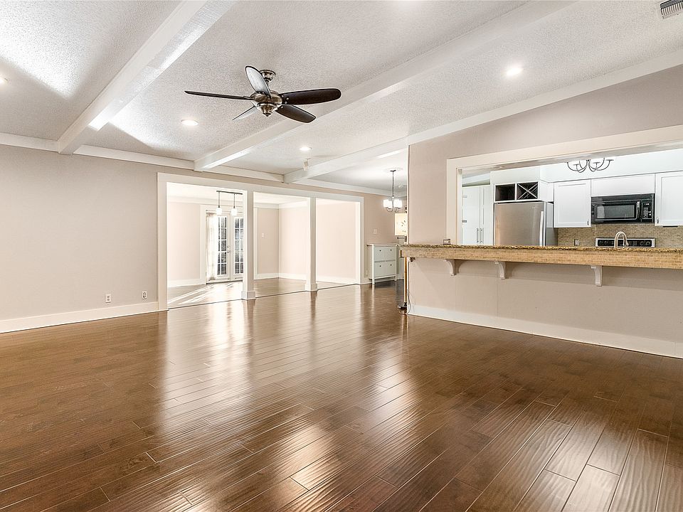 This elegantly remodeled home offers an open-concept design with high-end finishes throughout, including granite countertops, stainless steel appliances, custom cabinetry, designer lighting, and beautiful flooring. The expansive living area features an oversized brick fireplace and multiple built-ins for refined functionality.
