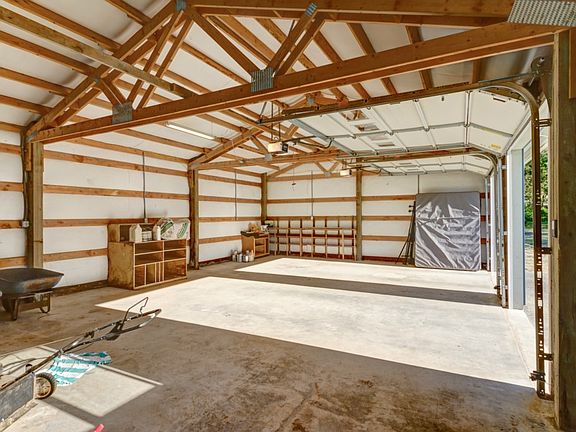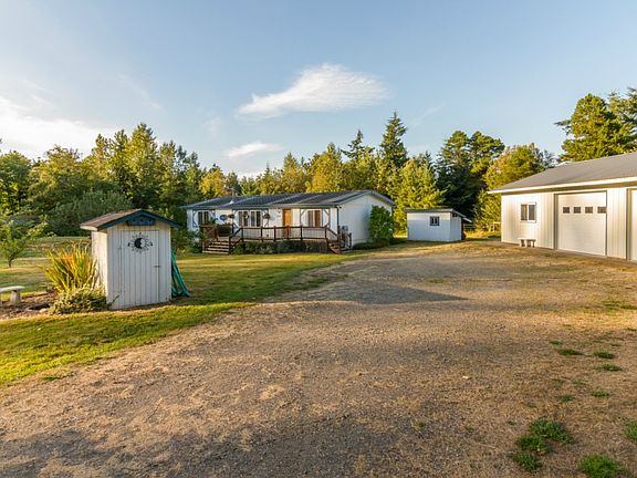 Bargain! Sunny mid-county property at a really sweet price! Set back on the lane, this private five-acre parcel has everything you are looking for. The home is three bedroom, two bath with a big kitchen and pantry, wood stove, nice appliances included. A whopping 2+ bay shop with metal roof and another large shed with electricity that has served as a terrific bonus room! The big deck overlooks the pretty gardens and fruit trees. Find the trails throughout the woods. Country quiet and private.