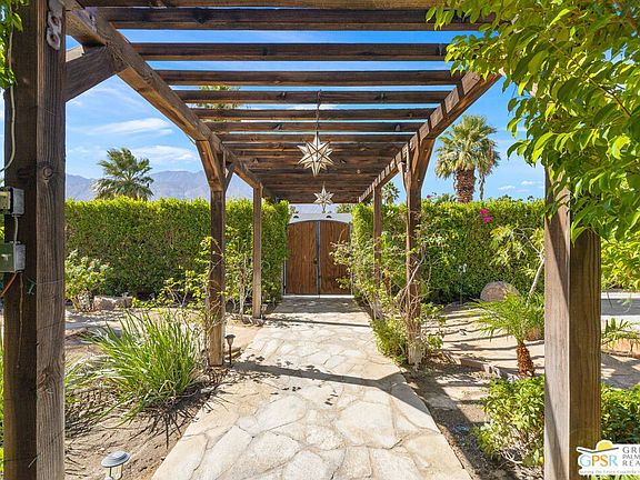 DESERT HIDEAWAY! Walled and gated for seclusion, this FURNISHED three bedroom, three bath ranch style residence unfolds with tall beamed ceilings, warm textures, and an easy indoor outdoor rhythm. Beyond the walk gate, a pergola draped in bougainvillea sets a romantic arrival framed by mountain views to the west. The front porch hints at the character within where the living room showcases a handmade Moroccan tiled fireplace, clerestory skylight, and those signature beams overhead. The dining area and kitchen open to an elevated veranda overlooking the pool and spa, a sun drenched setting designed for the desert good life. Pebble finished pool with its playful bridge, generous patio space, and multiple lounging zones create a relaxed resort atmosphere, complete with a newer BBQ ready for entertaining. The primary suite features vaulted ceilings, two closets including a large walk in, and direct pool access. Guest quarters enjoy thoughtful separation with one ensuite and another capturing the San Jacinto view. Newer copper plumbing in place from 2022. Tesla leased rooftop solar system in place. Set within Desert Park Estates on fee land, you own it. The generous lot and covered parking for four cars behind the drive gate complete this inviting Palm Springs retreat. Uptown Palm Springs and its vibrant scene are a short hop away.