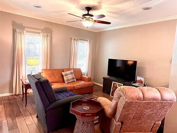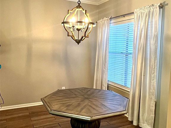 Side yardOpen floor planWood floorsIsland kitchenCrown moldingGas range