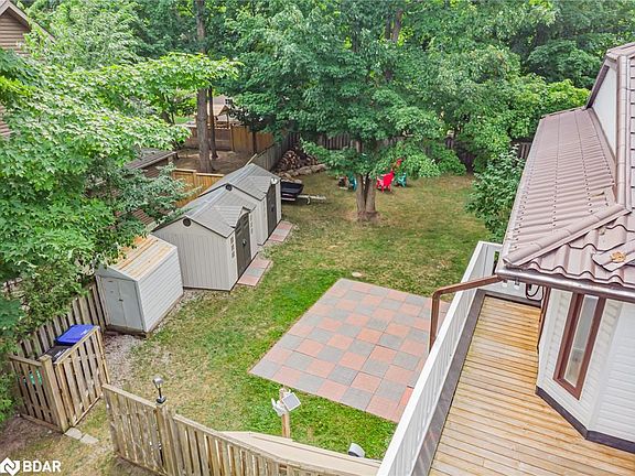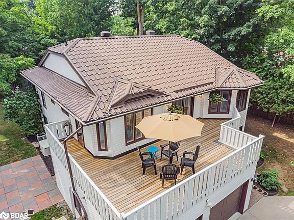 Set on an oversized 0.29-acre lot (approx. 95.94 x 139.09 ft), this property offers privacy, natural beauty, and room to grow. For a modest annual fee of $125, you can become a member of the Alcona Beach Club, which provides membership access to the private beach club along with two beaches. Enjoy a serene lake setting with pristine shoreline and sparkling waters, along with access to private events and exclusive membership perks. Towering trees create a tranquil, park-like setting for this residence, while the expansive, circular concrete driveway provides excellent curb appeal and ample parking for family and guests. The home's thoughtful raised bungalow layout is both functional and inviting, and the bright main level, situated on a slab foundation, features four walkouts. This floor features a family room with a wood-burning airtight stove, dining area, two full bathrooms, a kitchenette, a bedroom, and a spacious laundry/utility room. Set up for weekend guests, multi-generational living, or a future in-law suite. Upstairs is the heart of the home, with an open-concept living and dining area, a well-equipped kitchen, and multiple walkouts to a serene, tree-top deck, for dining or entertaining. This level offers three bedrooms and a beautifully tiled 6-piece bath. Large windows throughout the home fill the space with natural light throughout the day, creating a warm and uplifting atmosphere. Additional highlights include a durable metal roof, gutter guards, a heated double-car garage, and two garden sheds with hydro ideal for storage, hobbies, or workshop space. The fully fenced backyard offers mature trees, a fire pit area, and a double-wide gate for easy access and seasonal storage. There's even room for a future pool or custom deck to suit your lifestyle. Whether you're looking for a full-time residence or a peaceful weekend getaway, this home offers the best of lakeside living just 45 minutes from the GTA, and near the lake parks, schools, and amenities.