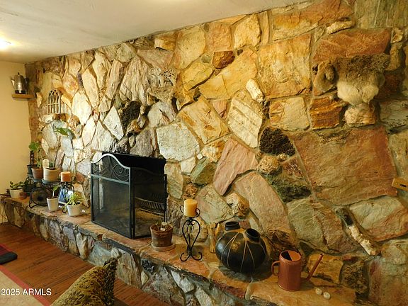 Amazing Views of Superstition Mountains & an Amazing Price Reduction too! This ranch home offers 3 BR's & 2 baths. Living area & kitchen offer bamboo floors, BR's have brand new carpet. Kitchen was updated in 2017 with Gorgeous cabinets & stone counters like you haven't seen before! Large table area for the big family gatherings. Be sure to take a close up look at the magnificent rock wall around the Fireplace at LR, it offers incredible finds, with Geodes of amethyst, & other quartz stones throughout. The master retreat also has its own fireplace, very romantic! The large master closet will delight you! 2 guest BR's are split from Master with the 2nd bath between them. New septic system installed Jan 2025 & New AC in 2023. Sits on 1.39 acres & offers separate workshop/studio