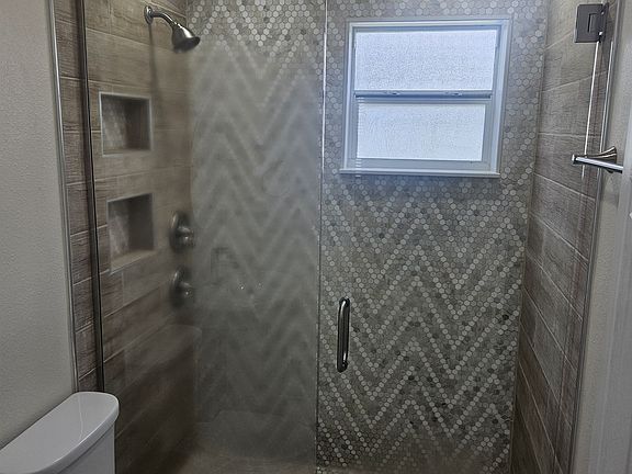 The home boasts fresh neutral paint, modern tile flooring throughout, wide baseboards, and updated ceiling fans in every room. The bathroom has been completely remodeled with a luxurious custom walk-in shower featuring a frameless glass door.