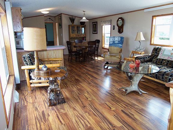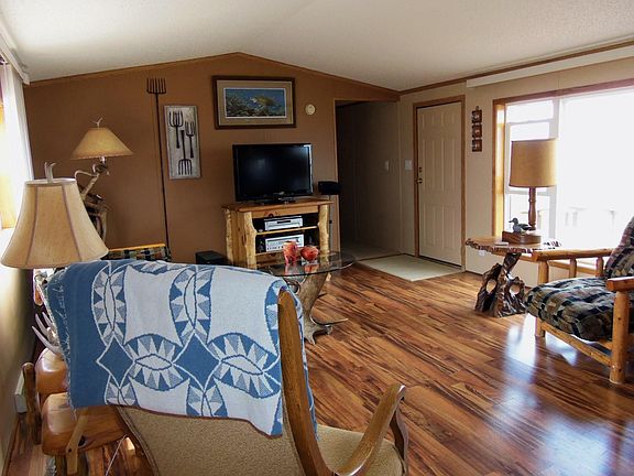Exceptionally well-maintained mobile home & pole building with concrete floor located directly off Hwy 1806. Steel roof, updated windows, fresh exterior paint & deck stain, updated plumbing fixtures and laminate flooring in kitchen, dining & living room add to the home. Stunning unobstructed views of Lake Oahe to the horizon. Abundant trees & foliage on this 4+ acre property. A piece of paradise.