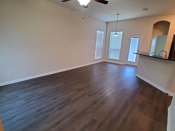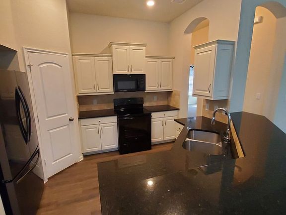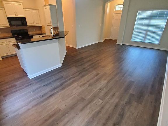 Open floor planDouble car garageVinyl plank flooringCarpet in the bedroomsGranite counter topsBlack appliancesLots of room