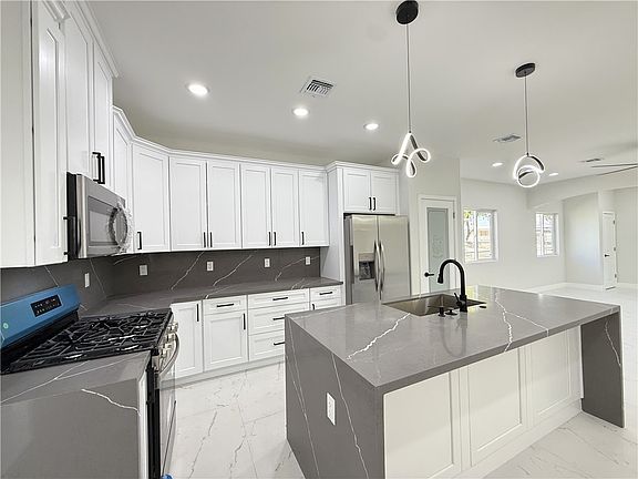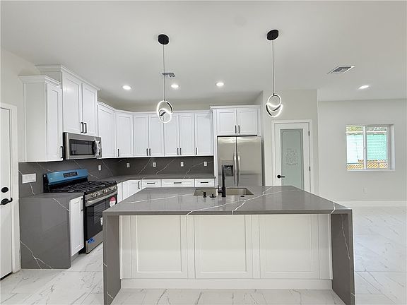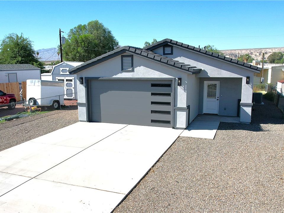 Welcome to this beautifully designed 3 bedroom, 2 bathroom new construction home, offering high-end finishes without the high price tag! Step inside to find sleek tile flooring throughout, an open and bright floor plan with a stunning waterfall kitchen island that serves as the centerpiece of the home. The kitchen features upscale lighting, white shaker cabinetry with black hardware, stainless steel appliance package (minus washer & dryer), and elegant quartz-style countertops that flow seamlessly through the backsplash for a refined, modern look. Both bathrooms are thoughtfully finished with contemporary fixtures, backlit mirrors, and floor-to-ceiling tile accents that create a spa-like atmosphere. Enjoy the convenience of a modern garage door with sleek windows, builder to install blinds at no additional cost, and side parking potential for extra space. The home is backed by an Arizona Standard Builder Warranty for added peace of mind. Perfectly situated near the Colorado River, local beaches, shopping, and schools, this home blends modern luxury with everyday practicality ideal for first-time buyers or those looking to downsize without compromise.