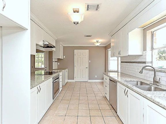 I love this home because it is in a very HOA friendly neighborhood. The neighbors are friendly and close to shopping and easy access to Hwy59. This is a very comfy home with solid surface in main living area and two bedrooms have carpet. This property has many possibilities with the huge back yard and detached garage, for out door kitchen or add-on for larger family there is room to grow or expand.