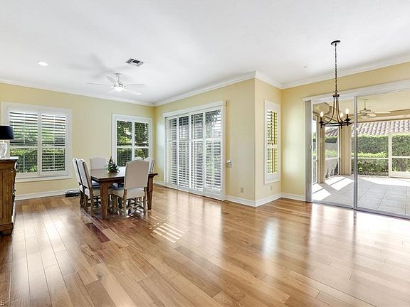Wonderful 4 bedroom home on a large private lot. Located on a quite cul-de-sac street with fenced in backyard, perfect for pets & kids. This well built home has been meticulously maintained and has many upgraded features. All hurricane impact resistant windows and front doors. Electric shutters close off the covered lanai for worry free storm preparation. Beautiful wood floors lend a rich feel to the family room, kitchen and 2 bedrooms. The lovely wood upgraded kitchen cabinets give tons of storage, while the breakfast bar gives an open feel and blends to the family room. A separate living room with dining room allow for multiple guests and entertaining while blending well with family living. Crown molding, high ceilings and tall doors give an upscale feel .The owner's suite has 2 ample closets and a well appointed bath with dual sinks, a soaking tub and a large shower. Southern exposure keeps this bright and sunny. Plantation shutters add the casual Florida ambience everyone loves. 2 more guest bedrooms are situated in a separate wing with a lovely guest bath. The 4th bedroom is in another wing making it perfect for a home office as well.