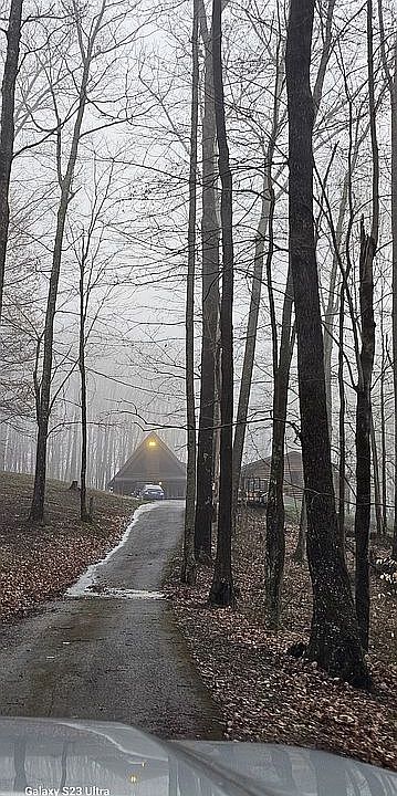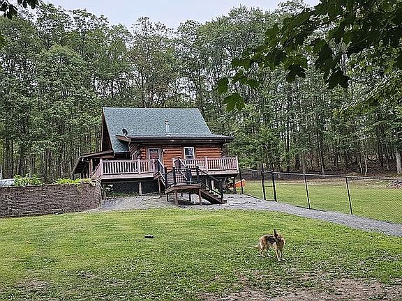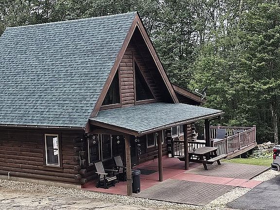 2 bedroom with 1 bath cabin nestled on 6.12 beautiful acres. Very peaceful. Enjoy the evenings sitting on the deck watching the wildlife. Whole house generator installed in 2022. New shingle roof on house installed fall 2025. 2 stall garage with attached large addition, currently man cave/game room. Enclosed porch on back of garage. Well water. Septic system. Central heat and air. Could turn spare room/ office into a 3rd bedroom.