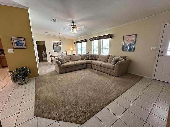 ACTIVE 55+ COMMUNITY - Fully furnished home situated on a desirable corner lot features a METAL ROOF and covered patio, perfect for relaxing or entertaining. Nice floor plan complete with vertical blinds and ceiling fans throughout. Spacious primary bedroom features an ensuite bathroom, with double vanities, a step-in shower, two large walk-in closets, and natural light. The kitchen is a chef's dream with abundant cabinetry, a large island, a farmhouse sink, and ceramic tile flooring. Adjacent to the kitchen, there s a separate laundry room for added convenience. A storage shed with a garage-style door, provides easy access for additional storage needs. Don't miss out on this incredible home in a beautiful location!