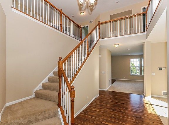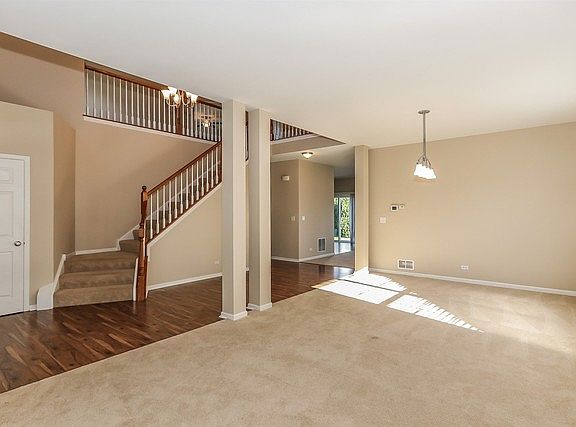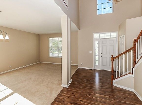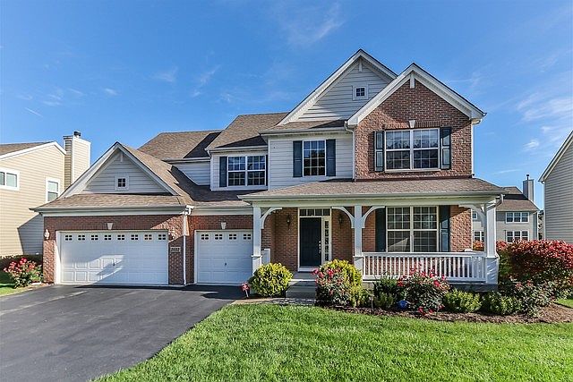 Gorgeous brick front estate home! Covered front porch great for summer nights! Very dramatic open floor plan! Soaring 2-story foyer leads into a spacious bright & airy living/dining room combo great for entertaining! Very functional eat-in kitchen with tons of extended custom white cabinetry, stainless steel appliances, tile backsplash, extra recessed lighting and sliding glass doors to the expansive concrete patio! Family room with many windows and extra recessed lighting opens to the kitchen! Tucked away 1st floor den for privacy! 2nd floor loft overlooks the foyer and is perfect for an office or play area! Large master bedroom with double door entry, 2 separate closets, tray ceiling, extra recessed lighting and private garden bath with soaker tub, separate shower and oversized dual sink vanity! Huge unfinished basement awaits your finishing touches! Great central location close to I-90 access, train, schools and shopping! Do the comps for square footage! Priced well below market!