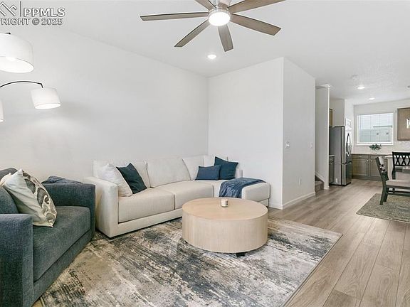 Seller willing to contribute towards an interest rate buy down! Better-Than-New 4-Bed, 4-Bath Townhome with Private Mother-in-Law Suite This better-than-new 4-bedroom, 4-bath townhome with a 2-car garage is move-in ready and perfectly located in the vibrant Victory Ridge community. Enjoy the convenience of nearby restaurants, shopping, theaters, a hospital, and the new fire station—all just minutes away. Take in stunning views of Cheyenne Mountain from your private concrete deck, perfect for relaxing or entertaining. The main-level open-concept living area offers abundant natural light, luxury vinyl plank flooring, and an upgraded metal handrail for a sleek, modern touch. The chef-inspired kitchen boasts dual corner windows, a coffee bar, quartz countertops, a walk-in pantry, a gas range, and plenty of counter and cabinet space. Upstairs, all bedrooms are pre-wired for internet and include ceiling fans for year-round comfort, while the versatile loft workspace with built-in cabinetry and quartz countertops is perfect for remote work. A full upstairs laundry room adds everyday convenience (Bonus - there is a second laundry on the lowest level). Private Mother-in-Law Suite The standout lower-level suite provides a private entrance, cozy living room, bedroom with custom closet, full bath, and laundry hookups. Its functional kitchenette—with a two-burner cooktop, sink, under-counter refrigerator, and quartz countertops—makes it ideal for guests, extended family, or even rental potential. Additional highlights include window blinds throughout, nearby guest parking, and durable luxury vinyl flooring on both the lower and main levels. With parks and open spaces just steps away, this versatile home truly offers a better-than-new experience in one of the city’s fastest-growing neighborhoods.