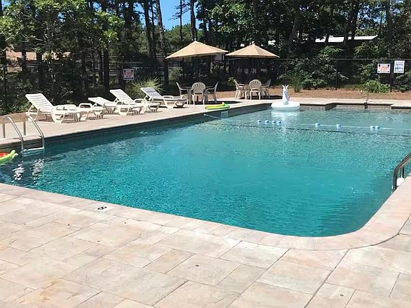 Sweet Starfish Vacation Village, 2 bedroom, free standing condo with an in-ground private, association pool and a short drive to Indian Neck Beach! Renovated in 2019 with 28' gated, sunny deck. New bathroom in 2023, new paint, out-door shower & hot water heater (25). Hard wood floors throughout with a cathedral open living area, ready to move in! Easy Cape Cod living with Birch shaded moss front yard and Hydrangeas.