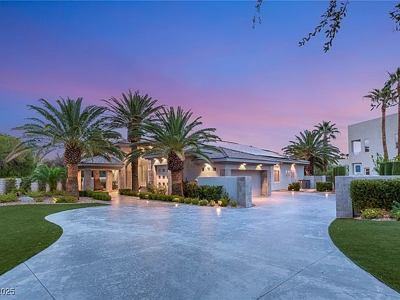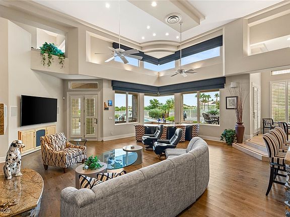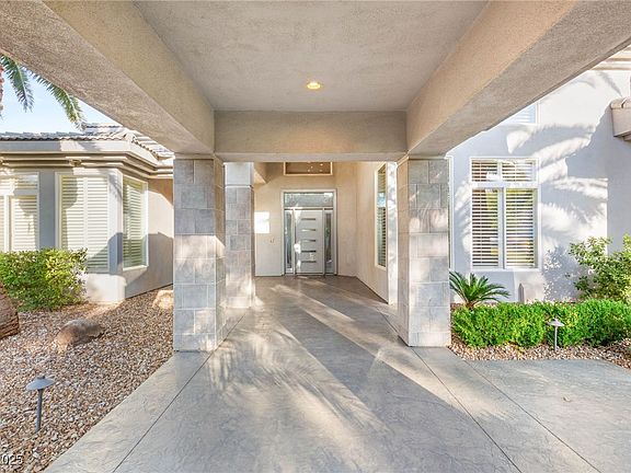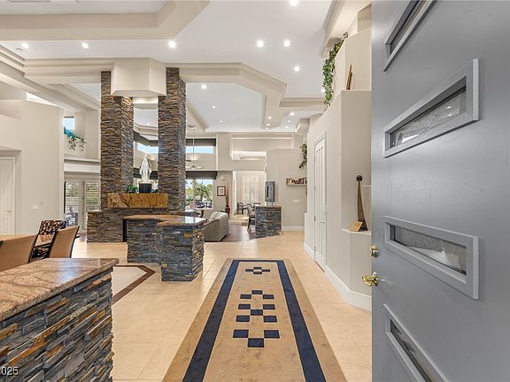 Located in the prestigious double-gated Legacy Estates at Grand Legacy, this custom home offers privacy, scale, and timeless design on one of the neighborhood’s most desirable lots. The property sits on over half an acre with more than 300 feet of golf course frontage, mature landscaping, and a long private drive that enhances its impressive curb appeal. Inside, soaring ceilings, architectural detailing, and stacked-stone accents create a warm, sophisticated atmosphere. Expansive glass windows in the living room frame the backyard, elevated golf course setting, and views of Sunrise Mountain. The kitchen features an oversized island with extended countertop seating, granite surfaces, and custom cabinetry. Each bedroom includes an en suite bath. The backyard is uniquely large for the community, with multiple covered lounge areas, a built-in BBQ, and a bar overlooking the resort-style pool and spa.