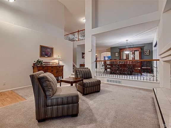 The perfect home awaits you, in desirable Bradford Village! Such a peaceful and quiet neighborhood. Incredible curb appeal, with charming front covered patio. Awesome spot for Adirondack chairs and your favorite hanging flower baskets. All atop an amazing lot, backing to a magnificent and expansive GREEN BELT! Best views in the entire neighborhood will be enjoyed from both levels of the house! True Colorado living at its finest. You'll be spending tons of time outside enjoying your low maintenance back yard on a huge patio surrounded by stunning landscaping! Mature trees, and truly vibrant flower colors in this impressive perennial garden. You'll feel like you are on vacation in your own yard! Great for your furry friends too, with smart doggy door access into house. You'll love the height of the cascading vaulted ceilings when you enter into this meticulous home. Light and bright, tons of natural light! Entertain your guests in elegant living room with a show stopping fireplace. This open floor plan also includes adjacent formal dining room. Main floor has surround sound and wired for whole house intercom. Main floor office could also be a non-conforming 6th bedroom located near full bathroom. Main floor laundry has a utility sink and ample shelving. The stylish stairway features attractive spindles leading you up to an ideal second floor that has it all! Huge loft!! Primary suite is complete with 5-piece bath and massive closet. Second floor also has three additional bedrooms, and another full bathroom! Finished basement with a family room, bedroom, and storage room (or use as a craft room, exercise room, or reading room). Rough in plumbing, awaits a future basement bathroom upgrade. Nicely finished 3 car garage (with epoxy floor coating) is perfect for all your toys and tools. Close to DIA, without the airport noise! Just steps from community pool, playground, tennis courts, dog park and walking paths! Hurry, this fabulous home will sell quickly.