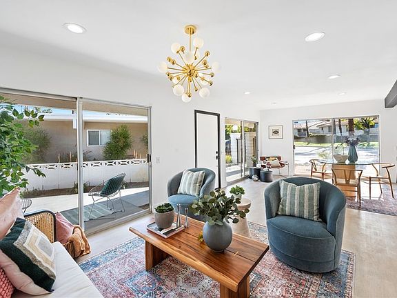 Experience the epitome of desert modernism in this fully remodeled, mid-century condo nestled in the highly coveted Firebird Estates, just steps from the vibrant heart of downtown Palm Springs. This exquisite property combines sleek modern luxury with enchanting historic charm, making it an ideal retreat for those seeking the quintessential Palm Springs lifestyle. Boasting two generously sized bedrooms and two full bathrooms, the condo is perfectly designed for entertaining and relaxation. The seamless integration of the family room, dining area, and kitchen welcomes you into a space ideal for gatherings, enhanced by floor-to-ceiling sliding glass doors that promote an indoor-outdoor living experience. The heart of the home, the kitchen, features all new appliances, striking mosaic tile range hood, flat panel walnut cabinets complemented by chic black quartz countertops adding a masculine touch. Down the hall lies the expansive primary bedroom, complete with an en-suite bathroom. This room features ample storage options, a built-in office area, and generous closet space, perfectly blending functionality with luxury. The primary bath includes dual vanity sinks, LED-lit mirrors, a standalone soaking tub, and a custom-tiled black and white shower, while the secondary bathroom delights with its playful pink tile & decor. Enjoy serene moments in the secondary bedroom’s adjoining cozy courtyard, perfect for tranquil mornings or starlit evenings. Limited to only 32 units, Firebird Estates boasts approximately 6 acres of meticulously daily maintained gardens, pool, and jacuzzi, all set against the breathtaking backdrop of the San Jacinto mountains. Located just a short walk from downtown, this condo offers effortless access to premier shopping, dining, and nightlife options, making it not just a place to live, but a lifestyle choice for those who aspire to the pinnacle of Palm Springs living. Seize the opportunity to own a piece of paradise and make this dream home yours.